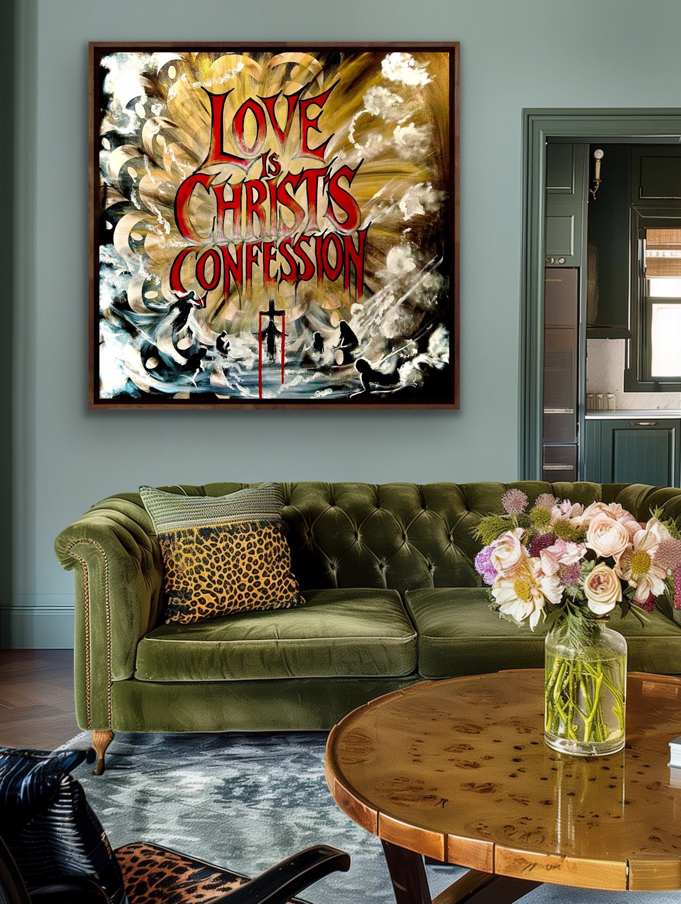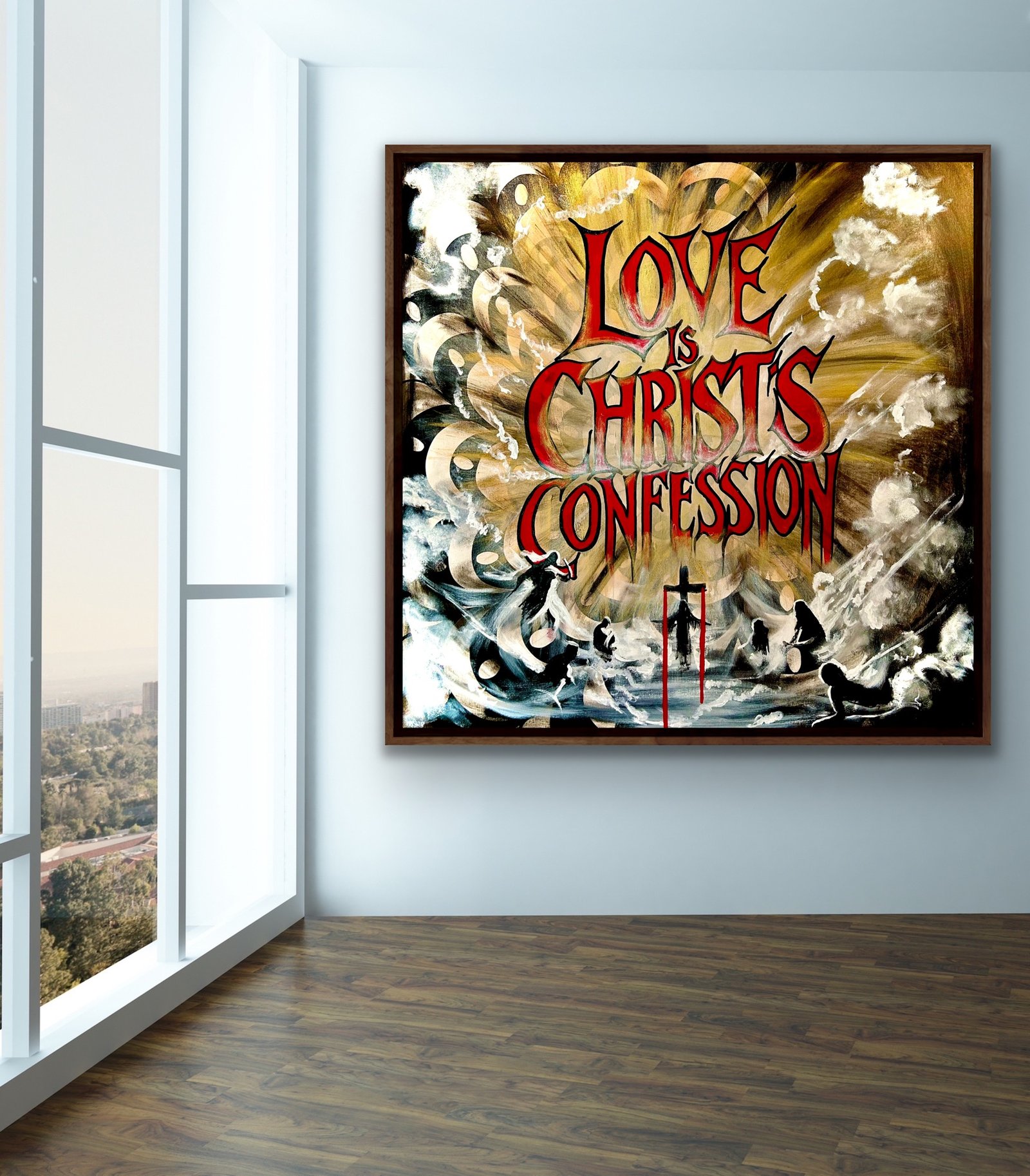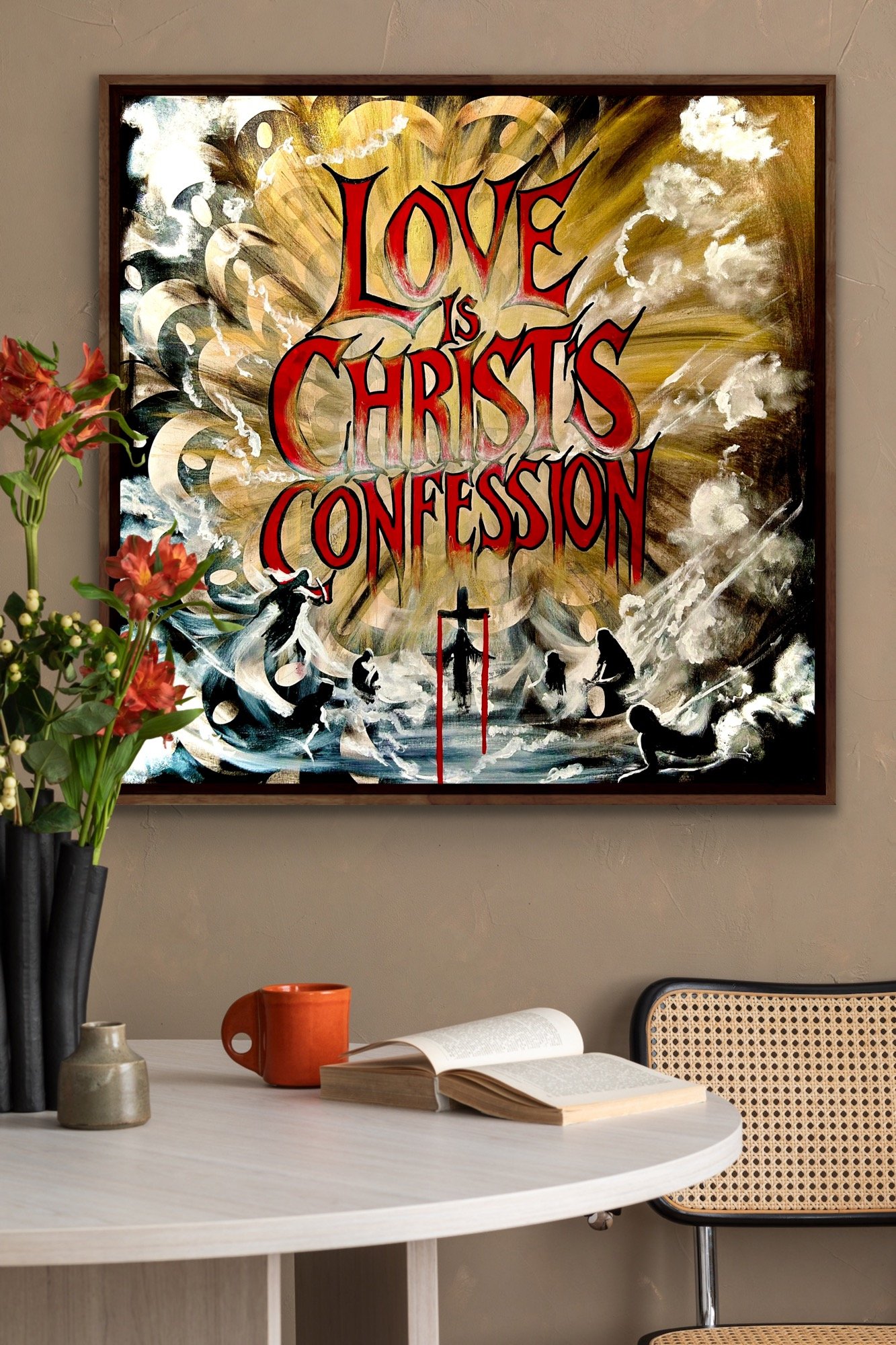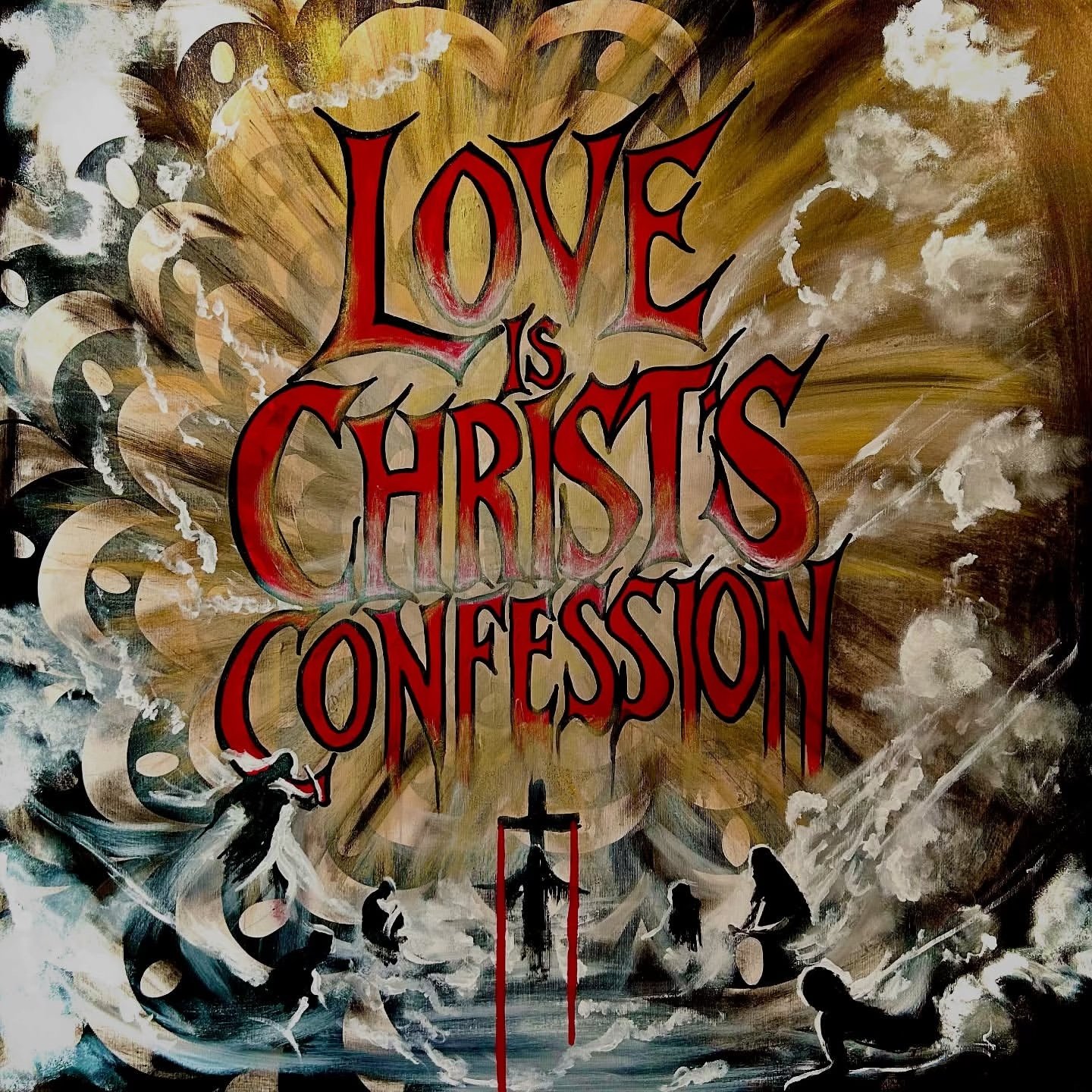 Der rohe, beinahe konfrontative Text „Love is Christ’s Confession“ zieht sich wie ein Manifest über die Leinwand.